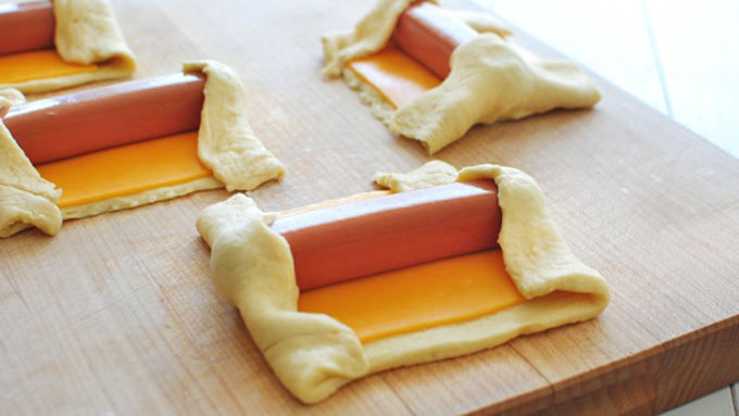 Step2Unroll the crescent rolls two at a time onto a lightly floured work surface. Keeping the two rolls together, form a rectangle. Pinch the perforated edges together. Lay the cheese in the center of the rectangle. Then place a hot dog on top of the cheese. Fold the short edges over the dog ends. Then roll them up. Pinch the dough together under the hot dogs.