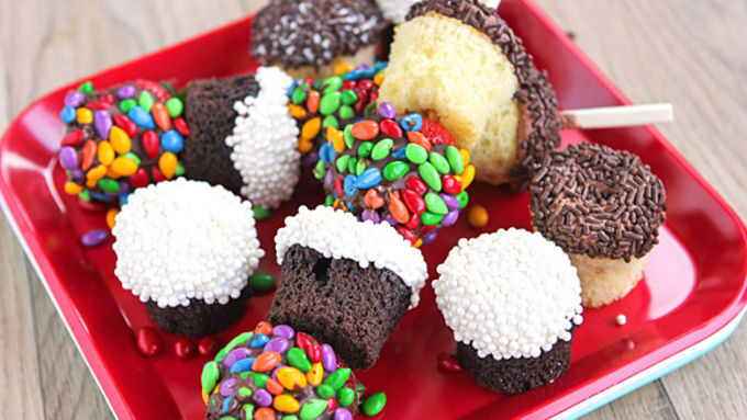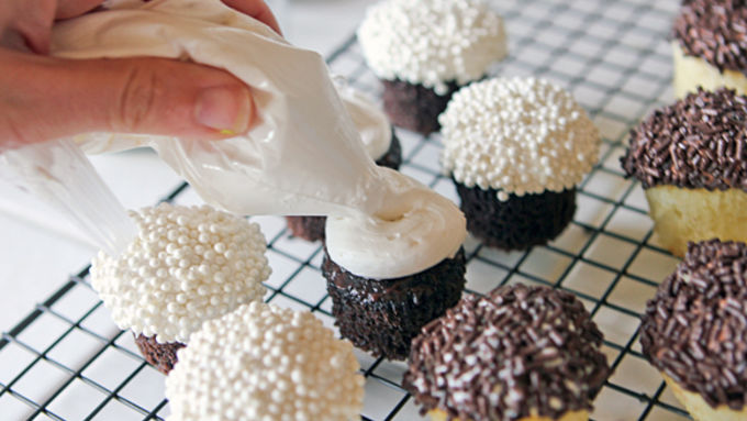 Step5Frost the top of the chocolate cupcakes with vanilla frosting. Dip in cupcake gem pearls. Frost the top of the vanilla cupcakes with chocolate frosting, then dip in chocolate sprinkles. Place in fridge to firm up the cake before skewering.