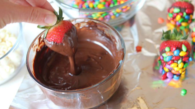 Step6Place chocolate chips in a microwave-safe bowl. Heat in 30-second bursts, then stir until melted. Dip strawberries into the melted chocolate, then roll in rainbow sprinkles.