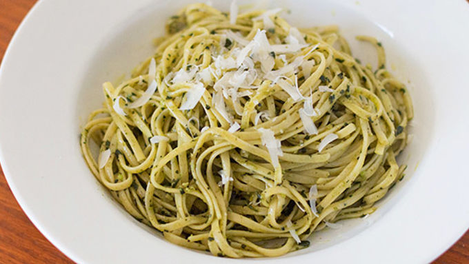 - Dandelion greens?! We know it's a weed, but did you know it also makes yummy pesto? Trust us, you'll wanna try it. Most people are probably familiar with basil pesto, but there are actually a bunch of different options when it comes down to the sauce. Dandelion greens are more bitter than basil, but in a totally good way. You’re probably thinking that dandelion greens are a weed(!) and you will actually pay money for them in the store(!), but that's okay. Try this business for yourself and see! This starts out just like regular pesto, with garlic, walnuts, olive oil and Parmesan cheese, but there’s the added twist of the dandelion greens. Pesto’s great because you can just throw all of the ingredients into the food processor and call it a day. So add in everything except the olive oil. You could serve this over pasta like I did, or use it on pizza, mix it with cream cheese and put it on a bagel, etc. etc. ... the possibilities are endless!