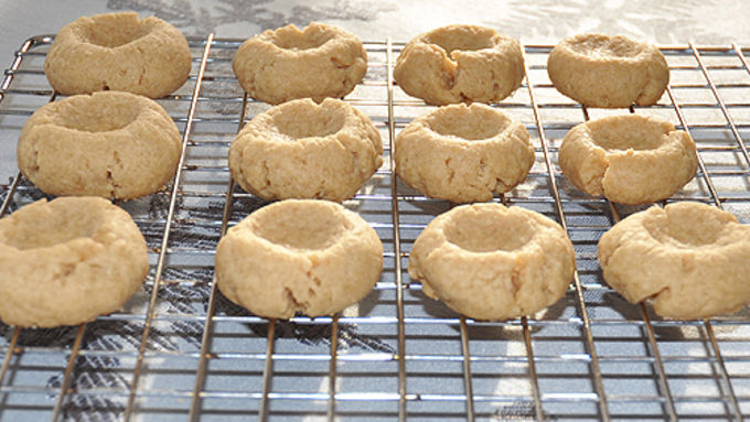 Step3With thumb, form deep indent in each cookie. Bake at 375° F for 10-12 minutes until firm but not brown. Remove cookies from sheet to a cooling rack and cool completely.