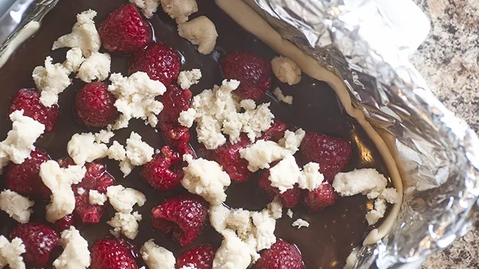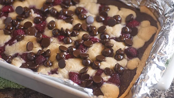 Step6In a small bowl, toss the raspberries with the sugar. Sprinkle the berries over the chocolate. Use your fingers to crumble the sugar cookie dough over the berries as evenly as possible.