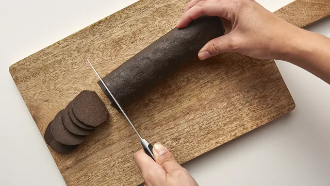 Divide dough in half; shape each half into a roll, 8 inches long and 2 inches in diameter. Wrap dough logs tightly with plastic. Refrigerate about 2 hours or until very firm.