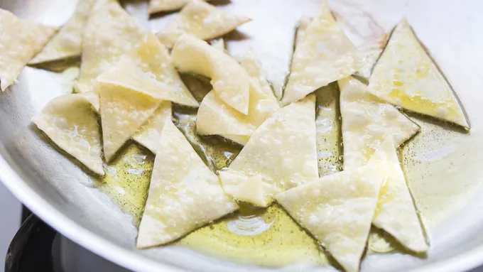 - 2 egg roll or wonton wrappers, cut into small triangles or strips