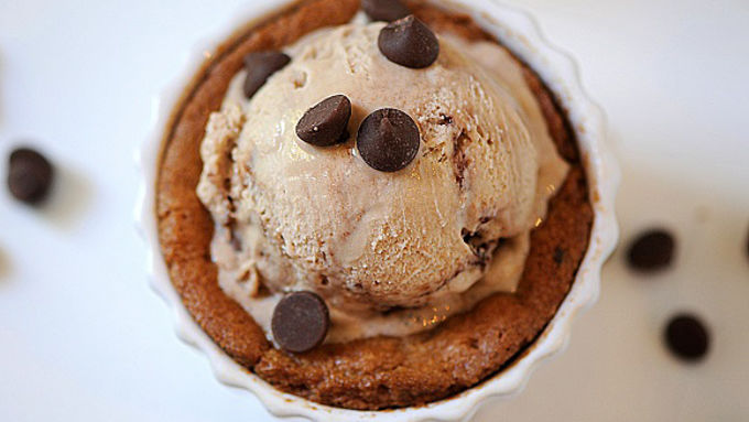 Step5Remove from oven and let cool for at least 5 minutes before serving, with or without a scoop of ice cream on top. (Cool completely if serving with ice cream so the ice cream does not immediately melt.) Top with extra chocolate chips if desired.