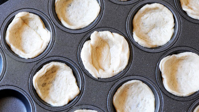 Step2Gently stretch each circle of dough (without tearing) and press into muffin cups.