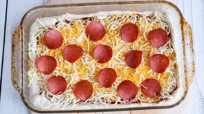 - This pizza is just insane – insanely good and insanely easy, that is. It honestly takes just 5 minutes to prep and then into the oven it goes. FIVE minutes! The ease of this pizza casserole is pretty amazing, but it’s the taste that gets everyone. We're pretty sure there is not one person on the planet that will not fall in love with this dish. You will need just three basics: Pillsbury™ Classic Crust Pizza Crust, pizza sauce and cheese. You can customize it to your liking by adding spicy sausage or other meats, your favorite veggies, or a variety of cheeses. Or just keep it super simple and top the pizza with some pepperoni and (tons) of cheese. The extras are all up to you, but just make sure if you are using any meat that it is pre-cooked. After your pizza goes in the oven, start checking for doneness after 15 minutes. You want the dough to be nice and soft and lightly golden. Cut the casserole into squares and dig in!