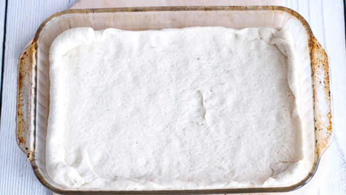 Step2Unroll the pizza dough, and press it into the bottom and halfway up sides of prepared baking dish.