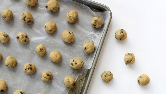 Step2Line a baking tray with wax or parchment paper. Scoop a small bit of the cookie dough (less than a tablespoon) and roll it into a ball between your palms. The ball should be no bigger than one inch across. Refrigerate the tray of dough balls for at least an hour (up to overnight).