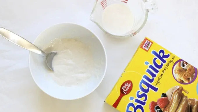 Step3To prepare your frying batter, mix 1/2 cup Bisquick with 1/4 cup milk. Gradually add up to 1/4 cup more milk, stirring, until the batter is a nice dipping consistency - runny, but not too thin. If you run out of batter while frying the dough balls, prepare a second mixture.