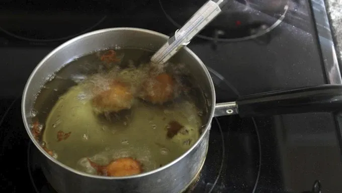 Step4Line a baking tray with wax or parchment paper and place a wire baking rack on the tray. Set aside. Pour about 1 quart of vegetable oil into a saucepan so the oil is two inches deep. Insert a candy or deep-fry thermometer into the oil and heat the oil until it reaches between 325-350°F. Keep the oil at this temperature while frying.