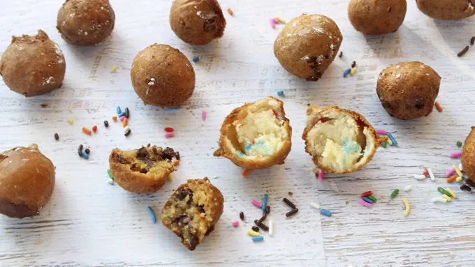 - First, stir up any flavor of Betty Crocker cookie mix you want. Then add whatever you like – sprinkles, small candies, nuts, dried fruit, or mini chocolate chips. As state fairs have taught us, you can deep fry anything! Mix a batch of chocolate chip cookies with mini chocolate chips. Or sugar cookie mix with rainbow sprinkles! For a cinnamony snickerdoodle version, mix the snickerdoodle dough with a few cinnamon imperials placed in the middle. Roll the balls in the cinnamon sugar that came with the package after you put the cinnamon chips inside. You may lose one or two of the imperials when frying, just to warn you. You can also roll the peanut butter dough balls around small pieces of a chocolate bar. Yum! To make the balls, just roll dough into a ball in your palms. The ball should be no more than an inch across. Any bigger and the inside won’t cook as well and may be too mushy. If you like, sprinkle the fried cookie balls with powdered sugar. Then enjoy! Really, really enjoy.