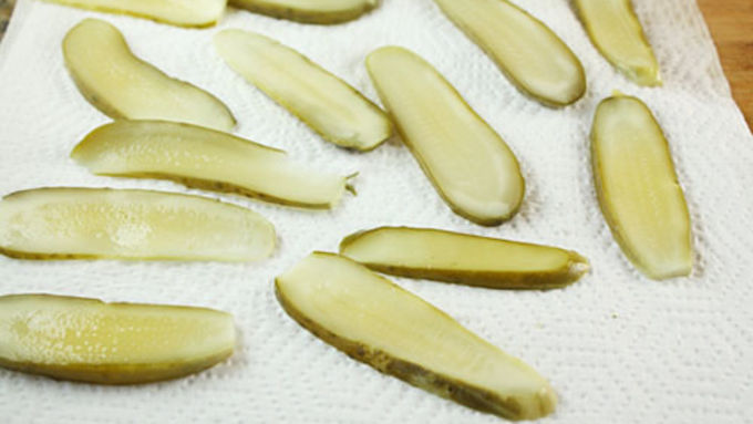 Step2Slice pickles thinly longwise. You should get 5 or 6 slices from one pickle.