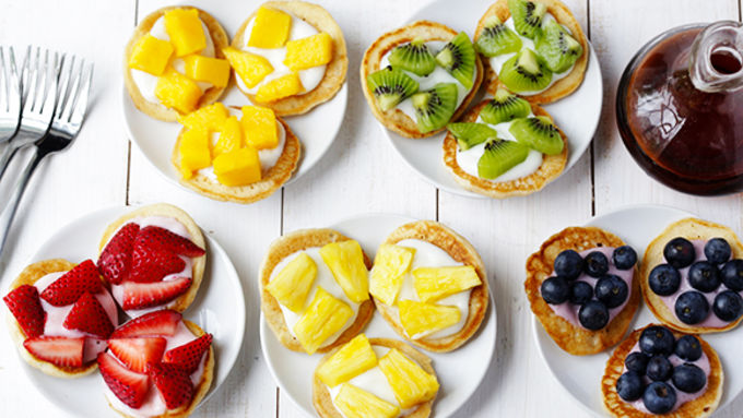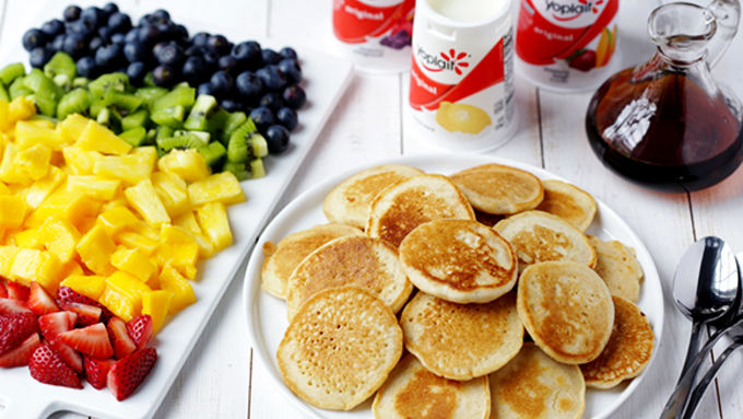 Step2Set up a pancake bar, with the mini pancakes, fresh fruit, yogurt and maple syrup for drizzling.