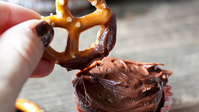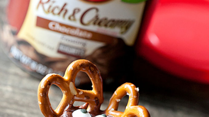 Step2Frost each mini cupcake top with the whipped chocolate frosting. Dip two mini pretzels in frosting, then place them on the cupcake in the antler positions. Push them in so they will stay upright.