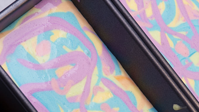 Step2Divide cake batter evenly into 6 small bowls. Add three drops of food coloring each to make rainbow colors pink, yellow, green, blue and purple. For orange, use two drops of yellow and one drop of red.