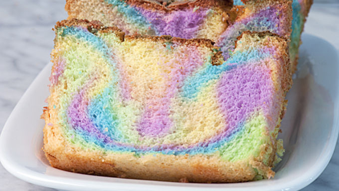 - I was excited to try my hand at this Double Rainbow pudding dessert! I was determined to squeeze every rainbow I could into this dessert – even if some had to go in sideways. A pudding-filled trifle with rainbow angel food cake was clearly the way to go. As you can see, there are actually a multitude of rainbows in Double Rainbow Trifle: squares of angel food cake, each with its own little rainbow; layers of the rainbow cake squares; and the custard, fruit and cake layers become bands of a larger pastry rainbow. Rainbow, upon rainbow, upon rainbow . . . why, it boggles the mind! The rainbow angel food cake was a breeze – just a matter of dividing the cake batter into small bowls and adding liquid food coloring. Next, make like Jackson Pollock and drizzle the colored batter into the loaf pans. Note to self: trifle aside; this rainbow angel food cake would be a quick, fun dessert to make with kids! Most trifle recipes call for moistening a single, large cake layer with a few tablespoons of liqueur. While you could certainly add some liqueur, my recipe doesn’t include this step because: the cake layers are thinner, and are interspersed throughout the trifle; the pudding is regular consistency, rather than extra thick; and the frozen fruit adds a little moisture as it thaws. I hope you enjoy Double Rainbow Trifle and it meets (or exceeds) your RDA of rainbows!