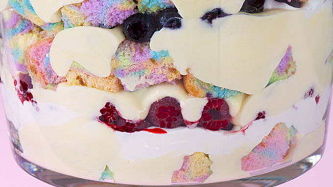 A sumptuous layered dessert with rainbow angel food cake, creamy vanilla filling, whipped topping and berries.