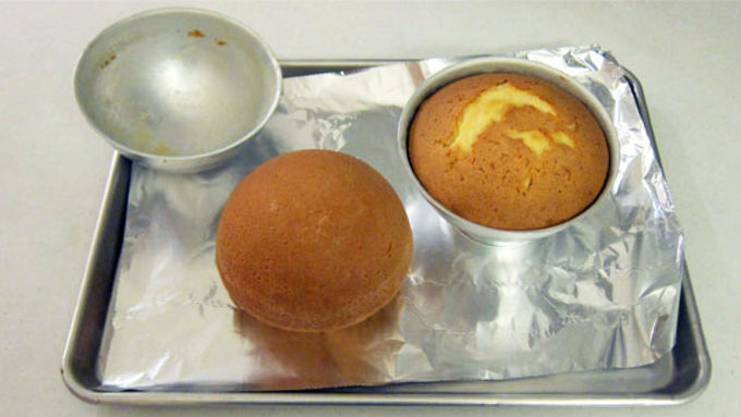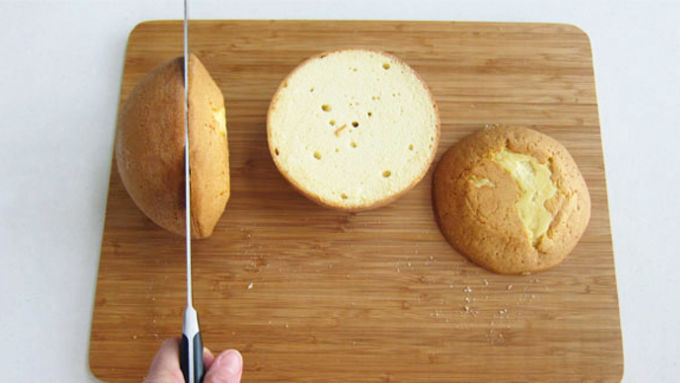 Step8Cut cakes into two sphere halves, removing the part of the cake that puffed up during baking.