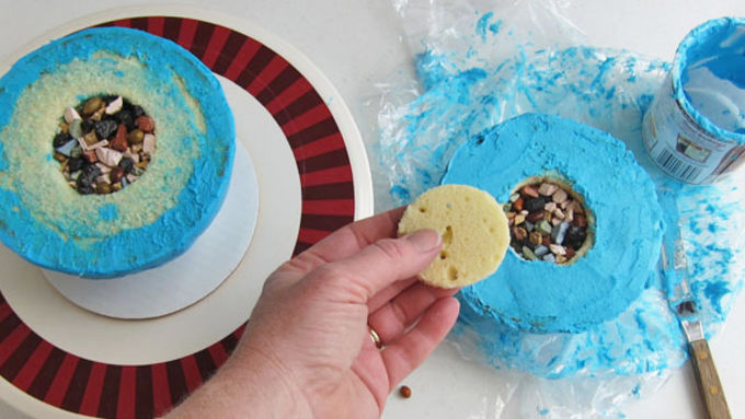 Step19Pour chocolate rocks into the well in the second cake, leaving a 1/2 inch of room at the top. Cut a 1/2 thick slice from one of the 2 1/2 inch round cake pieces. Frost around the edge of the cake and set it in the well over the candy to plug up the hole.