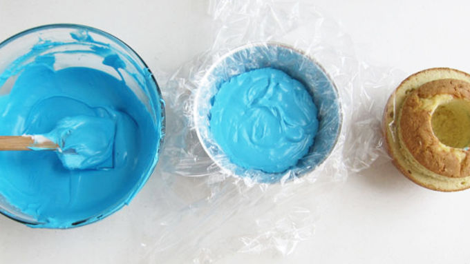 Step13Color two tubs of frosting ocean blue. Heat on high power in the microwave for three 10 second increments, stirring after each until smooth and pourable. Pour half of the frosting into each pan.