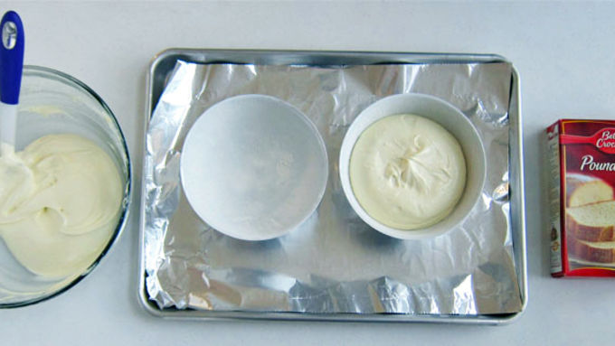 Step4Pour half of the batter into each pan. Set pans on metal rings on a baking sheet.