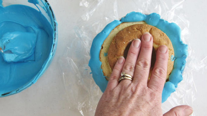 Step14Press one cake into each pan allowing the frosting to ooze up around the edges. Scrape off excess frosting, making the frosting and cake level with the edge of the pan.