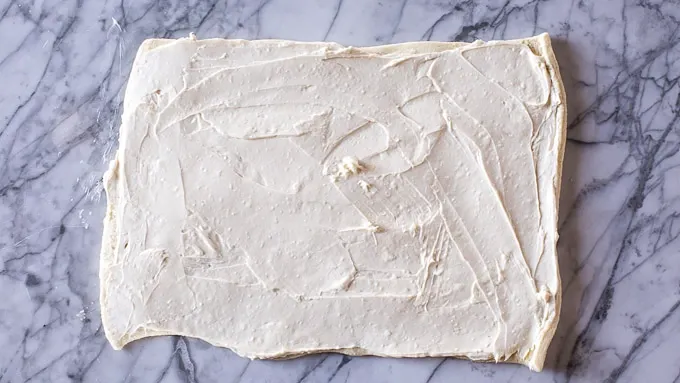 Unroll the crescent dough sheet. Spread the cream cheese mixture over the dough, leaving a 1/4-inch border around the edges.