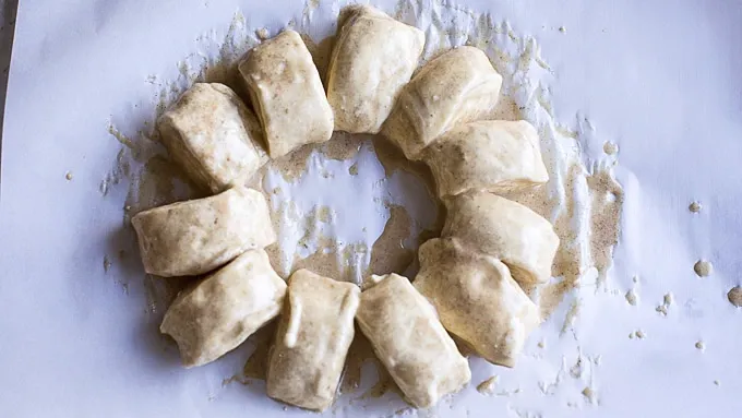 Remove the pastry from the fridge and arrange the slices in a circle on the prepared cookie sheet. Brush any remaining egg mixture left in the bag over the dough. Bake for 20-25 minutes or until golden brown.