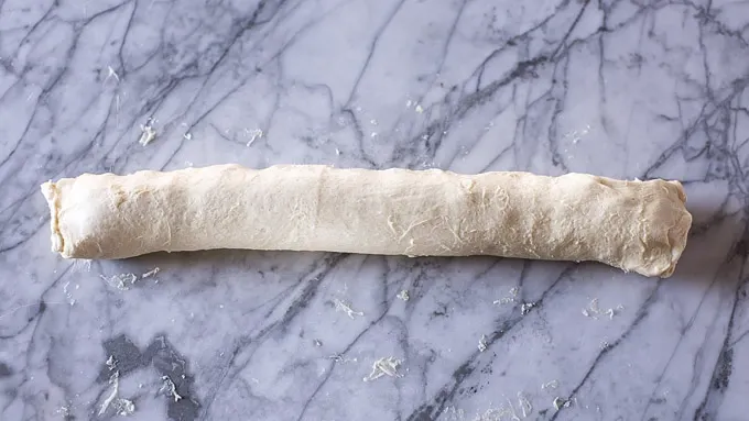 Starting with the long side of the rectangle, roll up into a log and then pinch the edges to seal.