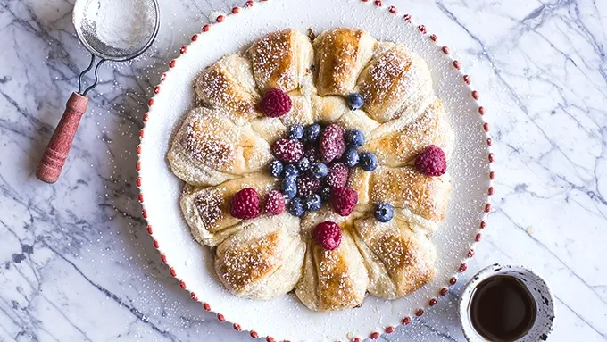 var configuration = {"title":"Easy French Toast Brunch Ring","introduction":"Whip up this make ahead French toast ring stuffed with fresh berries for your next girls\u0027 brunch!","servingSize":"1 Serving","image":{"small":{"media":"(min-width: 0px)","src":"https://mojo.generalmills.com/api/public/content/BiflCiJe10iVgfYjhPtt0Q_webp_base.webp?v=360b0de1\u0026t=e724eca7b3c24a8aaa6e089ed9e611fd"},"medium":{"media":"(min-width: 500px)","src":"https://rms-media-prod.generalmills.com/7702a439-1bf1-46e9-be0c-78ad8926eff3.jpg"},"large":{"media":"(min-width: 767px)","src":"https://rms-media-prod.generalmills.com/7702a439-1bf1-46e9-be0c-78ad8926eff3.jpg"},"alt":"Easy French Toast Brunch Ring"},"contributor":{"label":"by:","name":"Half-Baked Harvest","displayDate":{"label":"Updated","date":"Mar 21, 2017"}},"ingredientGroups":[{"name":"Filling","ingredients":[{"quantity":"1","description":"package (8 oz) cream cheese, softened"},{"quantity":"1/4","description":"cup sugar"},{"quantity":"1","description":"teaspoon vanilla extract"},{"quantity":"","description":"Zest and juice of 1 lemon"}]},{"name":"Crescent Ring","ingredients":[{"quantity":"1","description":"cup milk"},{"quantity":"4","description":"eggs"},{"quantity":"1","description":"tablespoon vanilla extract"},{"quantity":"1","description":"teaspoon cinnamon"},{"quantity":"1/2","description":"teaspoon salt"},{"quantity":"1","description":"can (8 oz) refrigerated Pillsbury™ Original Crescent Dough Sheet"},{"quantity":"","description":"Powdered sugar, whipped cream, fresh berries and maple syrup, as desired for serving"}]}],"steps":[{"description":"Using an electric mixer, beat together the filling ingredients until whipped and fluffy."},{"description":"In another clean bowl, whisk together the milk, eggs, vanilla, cinnamon and salt.","stepShotImageUrl":"//mojo.generalmills.com/api/public/content/F-TgkbQHFUm2Rf0tHdu5Fg_webp_base.webp?v=27a567cc\u0026t=3653fe2f5ecd4a47a5a51c97e429947c"},{"description":"Unroll the crescent dough sheet. Spread the cream cheese mixture over the dough, leaving a 1/4-inch border around the edges.","stepShotImageUrl":"//mojo.generalmills.com/api/public/content/9Jgg7XXtlkSF6PDxoP6Amg_webp_base.webp?v=1a5dd79c\u0026t=3653fe2f5ecd4a47a5a51c97e429947c"},{"description":"Starting with the long side of the rectangle, roll up into a log and then pinch the edges to seal.","stepShotImageUrl":"//mojo.generalmills.com/api/public/content/tdlUmfpaUUyzznJdEATKLA_webp_base.webp?v=cc42f6e9\u0026t=3653fe2f5ecd4a47a5a51c97e429947c"},{"description":"Using a serrated knife, cut the log into 12 slices. Place the slices in a gallon-size zip-top bag or 9x13-inch glass baking pan. Pour the egg mixture over the rolls; seal the bag (or cover the pan with plastic wrap) and place in the fridge for 30 minutes or up to overnight.","stepShotImageUrl":"//mojo.generalmills.com/api/public/content/yBS2bZMam0Cc9Uyg4sUzAQ_webp_base.webp?v=23af2948\u0026t=3653fe2f5ecd4a47a5a51c97e429947c"},{"description":"When ready to bake, preheat oven to 350°F and line a cookie sheet with parchment paper."},{"description":"Remove the pastry from the fridge and arrange the slices in a circle on the prepared cookie sheet. Brush any remaining egg mixture left in the bag over the dough. Bake for 20-25 minutes or until golden brown.","stepShotImageUrl":"//mojo.generalmills.com/api/public/content/Co7jE0EbO0SQYMVIye6MRQ_webp_base.webp?v=f5c22720\u0026t=3653fe2f5ecd4a47a5a51c97e429947c"},{"description":"Serve the French toast ring warm with a dusting of powdered sugar, fresh berries and a drizzle of maple syrup, if desired. You could also add a little whipped cream too!","stepShotImageUrl":"//mojo.generalmills.com/api/public/content/z_5_Ct-gtkeHi0eZC7vung_webp_base.webp?v=b605dd26\u0026t=3653fe2f5ecd4a47a5a51c97e429947c"}],"tips":[{"title":"","description":"Alternatively, arrange the slices of dough in a greased 9x13-inch glass baking pan. Pour the egg batter over the dough, cover and refrigerate until ready to bake (30 minutes to overnight). Bake and serve as directed.","category":"Variation","tipShots":[]},{"title":"","description":"With a nod to French toast but a much prettier presentation, this ring is definitely brunchworthy.\r\n\r\nAre you ready for an easy to make yet oh-so impressive French toast?\r\n\r\nCool, because I have a KILLER recipe for you today – it’s perfect for your next brunch, girl’s weekend getaway, or any occasion, really!\r\n\r\nThis French Toast Brunch Ring is pretty, but it’s also simple, easy AND you can prep it the night before. Then you’re all ready to go the next morning. YES! Now that is what I call a perfect brunch recipe.\r\n\r\nOh, and did I mention that this is made with crescent dough and stuffed with a delicious whipped cream cheese filling? I know, I know. Too good! \r\n\r\nIf a ring-shape isn\u0027t your style, alternatively, you can arrange the slices of dough in a greased 9x13-inch glass baking pan. Pour the egg batter over the dough, cover and refrigerate until ready to bake (30 minutes to overnight). Bake and serve as directed.\r\n\r\nServe the French toast ring warm with a dusting of powdered sugar, fresh berries and a drizzle of maple syrup if desired. \r\n\r\nGorgeous. Now... dig in!","category":"Editorial","tipShots":[]}],"kitchenTips":[{"title":"","description":"Alternatively, arrange the slices of dough in a greased 9x13-inch glass baking pan. Pour the egg batter over the dough, cover and refrigerate until ready to bake (30 minutes to overnight). Bake and serve as directed.","category":"Variation","tipShots":[]}],"additionalContent":[],"faq":[],"tipCategories":[{"categoryName":"Editorial","heading":"More About This Recipe","cssClass":"recipePartStory","expandOnInit":false,"expandText":"More +","collapseText":"Less -","expandEventName":"","collapseEventName":"","image":"","tips":[{"title":"","description":"With a nod to French toast but a much prettier presentation, this ring is definitely brunchworthy.\r\n\r\nAre yo