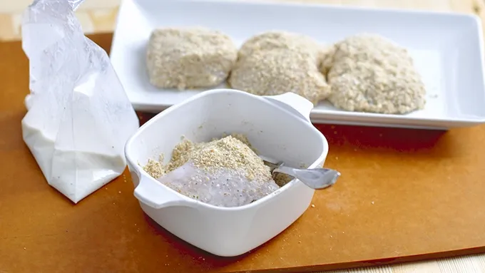 Step4Once the oil is hot, take the chicken out of the buttermilk mixture one piece at a time. Roll it in the breadcrumb mixture, pressing the mixture into the chicken to fully coat.