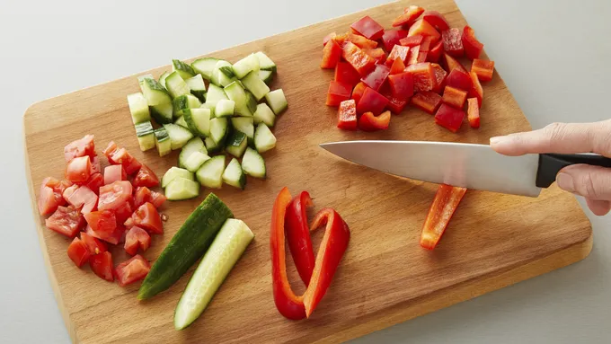 Step2While pasta is boiling, chop vegetables. Drain pasta and cool (to speed up cooling process, put pasta into a bowl ice cold water).