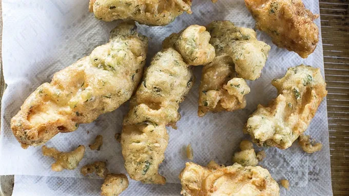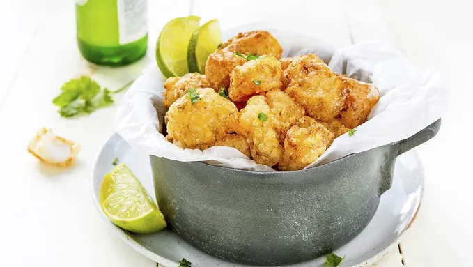 Step4Pat the fish dry and season on both sides with salt and pepper and then coat the fish in the beer batter. Next, carefully lower the fish into the hot oil. Fry the fish, turning over frequently, until deep golden and cooked through, about 4 to 5 minutes. Transfer to a paper towel-lined sheet to drain, then to a baking sheet to keep warm in the oven. Fry the remaining fish.