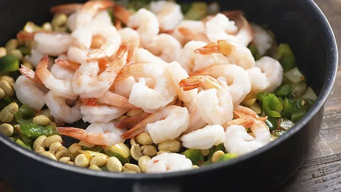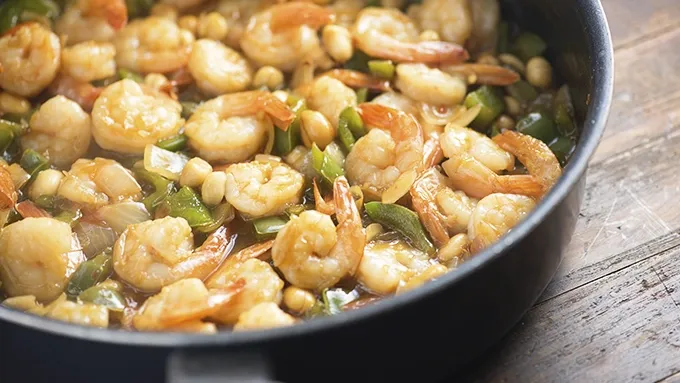 - Stop right there. Put down the phone. Walk away from the takeout menu. Head to the kitchen. We’re making the simplest dang Kung Pao Shrimp you’ve ever seen. You don’t need any fancy tools and you don’t need any crazy ingredients. I used a bag of fully cooked, frozen shrimp. It had already been peeled and deveined, but the tails were still on. You can use shrimp without tails if you prefer, but I find tails add a little extra flavor to the dish and they look pretty when serving. (They’re a bit harder to eat around though.) You do you! Once everything is hot and the sauce has thickened, pour it right into a bowl alongside some rice and dig in—no delivery driver needed.