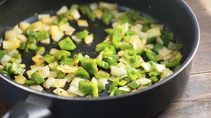 Step2Dice pepper and onion. Add to oil and cook for 2 minutes, stirring often.