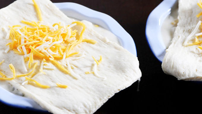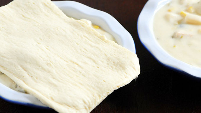 Step6Unroll dough; separate into 4 squares. Place 1 square over each ramekin or pie dish.
