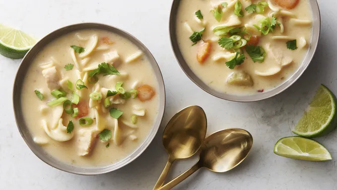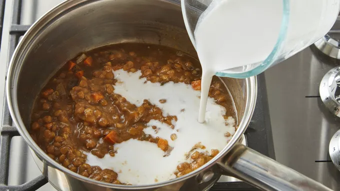Step2Stir in soup and coconut milk; increase heat to medium-high. Heat to simmering; cook 1 to 2 minutes or until heated through and slightly thickened.