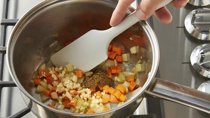 Step1In 2-quart saucepan, heat oil over medium heat. Add onion and sweet potato; sauté 2 to 3 minutes or until potatoes just start to soften. Add garam masala, garlic and gingerroot; sauté 30 to 40 seconds or until fragrant.