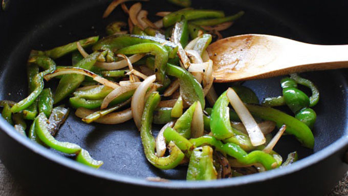 Step2Back in the skillet, add the remaining 2 teaspoons oil. Add the onions and peppers; sauté until they start to soften and brown, about 5 minutes. Season with a pinch of salt. Remove from the skillet.