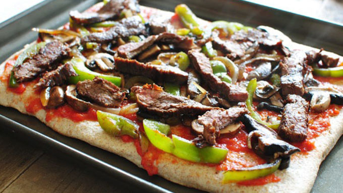 - What you are seeing is not a figment of your imagination. Have you ever put a cheesesteak on your pizza? You should put a cheesesteak on your pizza. Let me tell you about putting a cheesesteak on your pizza. A) There's thinly sliced flank steak involved. I know you technically use, what, sirloin on a cheesesteak? You're totally allowed to do that if you want! I just chose flank because the breezes of my inner energy pool blew me in that direction. B) There are sliced onions and green bell peppers involved. I mean, how yummy does that sound? C) There are earthy, delicious sliced mushrooms involved. D) There are strips of provolone cheese involved. On top of everything. All melted and bubbly and magnificent. All of this, on top of a pizza. HA-BAM. Put a cheesesteak on your pizza.