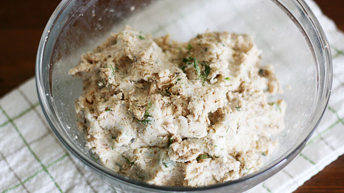 Step2In a large bowl, combine cooled potatoes, salmon flakes, breadcrumbs and chopped fresh dill; stir or use hands to thoroughly combine.