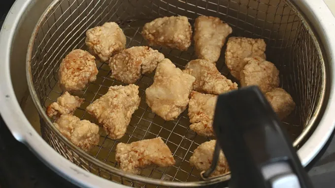 Step4Dredge the chicken pieces in the cornstarch, shake off excess, and working in batches, deep fry the chicken in oil heated to 375°F until the chicken is golden brown, crispy and cooked through. Place the chicken on paper towels.![]()