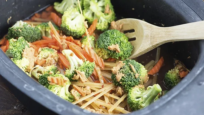 - Let’s be real here for a minute. Is there anything in this world better than a pile of takeout and an endless stream of Netflix? Of course not. Except, sometimes people live in an area that just doesn’t have the best takeout options. Sometimes those people are me. Sometimes I suck it up and eat the bad takeout, and sometimes I take 5 minutes (no, really! just five minutes) to toss some noodles and peanut butter and chili garlic paste into my slow cooker for a ridiculous Thai-inspired dinner that is perfect served alongside Netflix. Or friends and family. Whatevs. Toss a bunch of stuff in a slow cooker. Man, this is tough. You want some fettuccine noodles, chili garlic paste (add more or less depending on how tough you are!), peanut butter and some veggies. Your mom said you had to eat them and she knows what she’s talking about, okay? Stir things up. Try to smear that peanut butter all up in there. It’ll look a mess, but things are going to work. Have faith. Cook that up for 45 minutes. I mean, you totally have time for one more episode while it’s cooking, right? Plate ‘er up and top with some peanuts and cilantro. Heaven. In a bowl. This is the easiest thing you’ll do all week.