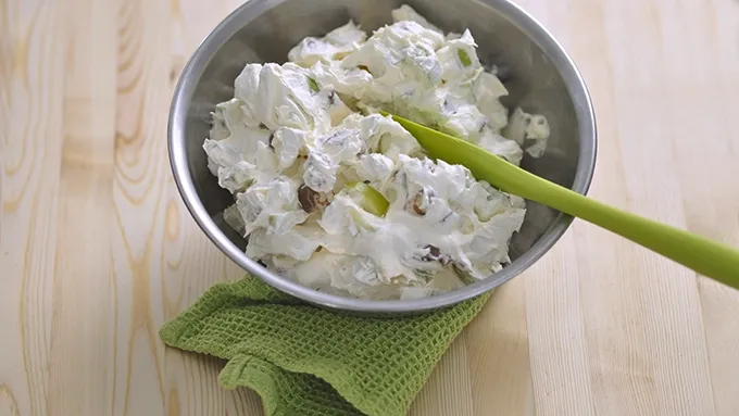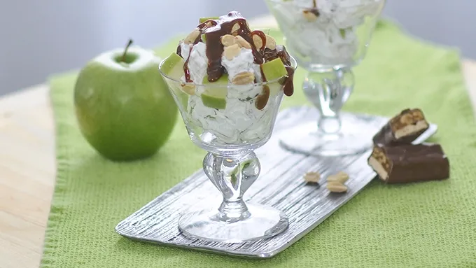 - Snickers™ Salad is well-known in church potluck circles. It’s a vintage recipe that you can’t forget once you’ve tasted it. Of course, the name rather hilariously overlooks the fact that cubes of crisp green apples are also enveloped in dreamy, creamy white perfection. So why isn’t it called Apple Salad? Because…candy bars. In something called a salad. Is this not genius? You can mix this up in a few minutes flat, so check it out the next time you’re the one tagged to bring something to the party. And hey, you get to decide if you put it on the table with the salads—or the desserts! Serve it up in little glasses or bowls. Or just put the big bowl out and let people help themselves. But whatever you do—top it with a bit of caramel drizzle and a few salty peanuts. Then, dig in to sweet-salty-fruity paradise!