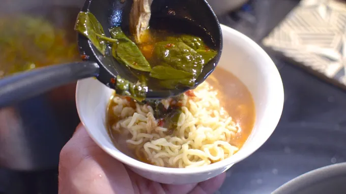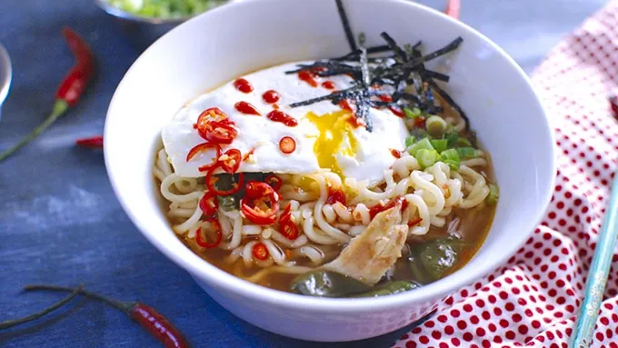 var configuration = {"title":"Easy Spicy Chicken Ramen Noodle Soup","introduction":"The perfect hybrid of fancy restaurant-style ramen and the pre-packaged instant noodles eaten by college kids, this easy ramen noodle recipe is a filling meal that will satisfy any ramen craving. Replacing the powdered soup packet with a homemade soup mix of chicken stock, rotisserie chicken, garlic, ginger, spinach—and classic ramen toppings like seaweed, soft-boiled eggs and scallions— ordinary ramen noodles turn into a spicy chicken ramen noodle feast that’s ready in just 30 minutes.","servingSize":"1 Serving","image":{"small":{"media":"(min-width: 0px)","src":"https://mojo.generalmills.com/api/public/content/CxPaGbsTREeCrFeAUQo52Q_webp_base.webp?v=65259a0c\u0026t=e724eca7b3c24a8aaa6e089ed9e611fd"},"medium":{"media":"(min-width: 500px)","src":"https://mojo.generalmills.com/api/public/content/CxPaGbsTREeCrFeAUQo52Q_webp_base.webp?v=65259a0c\u0026t=191ddcab8d1c415fa10fa00a14351227"},"large":{"media":"(min-width: 767px)","src":"https://mojo.generalmills.com/api/public/content/CxPaGbsTREeCrFeAUQo52Q_webp_base.webp?v=65259a0c\u0026t=191ddcab8d1c415fa10fa00a14351227"},"alt":"Easy Spicy Chicken Ramen Noodle Soup"},"contributor":{"label":"by:","name":"The Food in My Beard","displayDate":{"label":"Updated","date":"Jul 2, 2019"}},"ingredientGroups":[{"ingredients":[{"quantity":"9","description":"ounces ramen noodles"},{"quantity":"1","description":"quart chicken stock"},{"quantity":"2","description":"cups water"},{"quantity":"1","description":"cooked rotisserie chicken, bones removed"},{"quantity":"2","description":"cloves garlic, grated"},{"quantity":"1","description":"thumb-sized piece of ginger, grated"},{"quantity":"2","description":"tablespoons soy sauce"},{"quantity":"2","description":"tablespoons sriracha sauce"},{"quantity":"1","description":"tablespoon rice vinegar"},{"quantity":"1","description":"handful spinach (optional)"}]},{"name":"Toppings","ingredients":[{"quantity":"","description":"Dried seaweed"},{"quantity":"","description":"Scallions"},{"quantity":"","description":"Soft-boiled egg"},{"quantity":"","description":"Sriracha sauce"},{"quantity":"","description":"Sliced Thai chilies"}]}],"steps":[{"description":"Mix all of the ingredients except the noodles. Bring to a simmer.","stepShotImageUrl":"//mojo.generalmills.com/api/public/content/TQ6Hp3rY30SumBCxEXBPsg_webp_base.webp?v=9aa46711\u0026t=3653fe2f5ecd4a47a5a51c97e429947c"},{"description":"Meanwhile, bring some water to a boil. Boil the ramen for 3 minutes until tender and strain."},{"description":"Add the noodles into your bowls and ladle broth on top.","stepShotImageUrl":"//mojo.generalmills.com/api/public/content/tlQ2IhqlEUmcy8YzU95Q1g_webp_base.webp?v=cd536813\u0026t=3653fe2f5ecd4a47a5a51c97e429947c"},{"description":"Top with toppings before serving.","stepShotImageUrl":"//mojo.generalmills.com/api/public/content/dJXSdwH3GESbE6gO9lP1Eg_webp_base.webp?v=6578ed53\u0026t=3653fe2f5ecd4a47a5a51c97e429947c"}],"tips":[{"title":"","description":"While fresh ramen noodles can be used, dried ramen noodles work just as well. Be sure to cook noodles to desired doneness. ","category":"Recipe/Ingredient Facts","tipShots":[]},{"title":"","description":"If you prefer even spicier ramen, you can add in chopped fresh jalapeño or Thai chilies, Shichimi Togarashi (a Japanese chili pepper mix) or white pepper to taste.","category":"Variation","tipShots":[]},{"title":"","description":"Coarsely chopped fresh bok choy can be substituted for the spinach.","category":"Substitution","tipShots":[]},{"title":"","description":"Other popular toppings include: fishcakes, chashu (slices of roasted pork), bean sprouts, menma (preserved bamboo shoots) and corn. ","category":"Variation","tipShots":[]},{"title":"","description":"Now that you’ve learned how to make your own ramen noodle soup at home, the next step is mastering \u003ca href=\u0022https://www.tablespoon.com/posts/how-to-make-ramen-noodles\u0022\u003ehow to make ramen noodles from scratch.\u003c/a\u003e ","category":"Recipe/Ingredient Facts","tipShots":[]},{"title":"","description":"While spicy chicken ramen noodle soup is great, you probably can’t eat it everyday. So why not mix it up with these other delicious \u003ca href=\u0022https://www.tablespoon.com/dishes/soup\u0022\u003esoups\u003c/a\u003e to get you through the winter?","category":"Serving Suggestions/Menu","tipShots":[]},{"title":"","description":"This ramen soup is an easy way to transform simple noodles into a rich and flavorful dish. \r\n\r\nRamen can mean a lot of different things these days. We’re all familiar with the ramen noodle packets from our college days, but recently high-end ramen places have been popping up all over the place.\r\n\r\nSome ramen packages are better than others, but for the most part the sodium levels are completely off the charts. On top of that, a ramen packet will never really satisfy the craving for that really good ramen you get at a noodle bar – and to make that at home is a ton of work.\r\n\r\nThis recipe falls somewhere in between a ramen packet and a bowl of that fancy stuff, but is super easy to make at home. It’s the perfect thing to have if you really want good ramen but don\u0027t have the money or time or ability to go out and get it (and you don\u0027t want to simmer a bone stock for 24 hours).\r\n\r\nTry and get good fresh ramen noodles from an Asian market, but dried ramen noodles work too. \r\n\r\nLoad it up with all your favorite ramen toppings! This soup satisfies so many cravings and is perfect for this freezing weather!\r\n\r\nTo ensure there are no issues with food safety, cook eggs until both the yolks and whites are firm and not runny. ","category":"Editorial","tipShots":[]}],"kitchenTips":[{"title":"","description":"While fresh ramen noodles can be used, dried ramen noodles work just as well. Be sure to cook noodles to desired doneness. ","category":"Recipe/Ingredient Facts","t