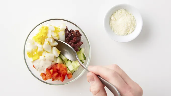 Step2In a small mixing bowl, stir together the egg, red pepper, cucumber, olives and Caesar dressing. Stir in the Parmesan and season to taste with salt.