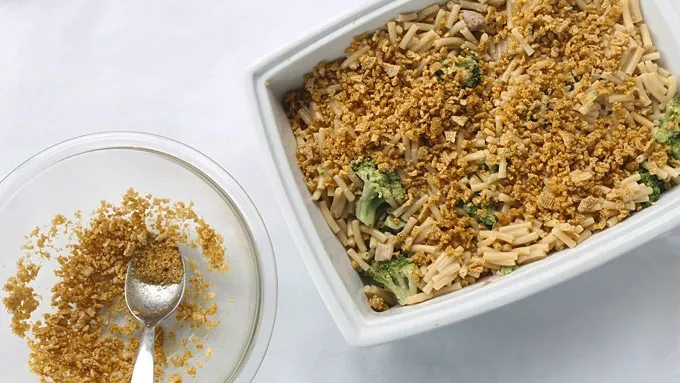 Step3Place the Bugles™ in a zip-top bag and seal. Crush the Bugles™ with a rolling pin or mallet. Melt 2 tablespoons of butter in a microwave-safe bowl. Mix the butter with the crushed Bugles™ and sprinkle mixture on top of the casserole.