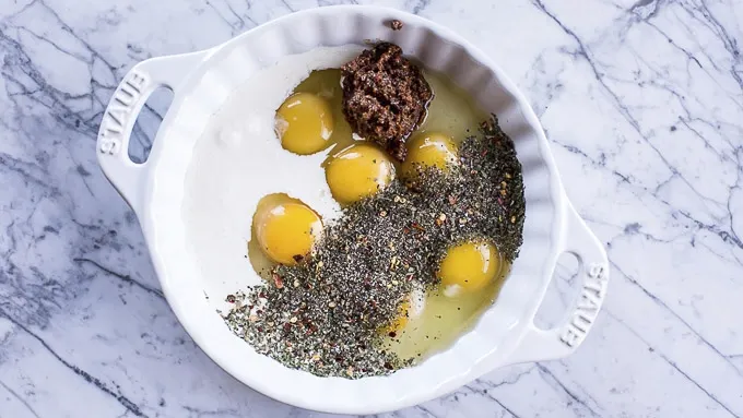 Step2Meanwhile, whisk together the eggs, heavy cream, sun-dried tomato paste, dried herbs and a pinch of salt and pepper in a bowl.