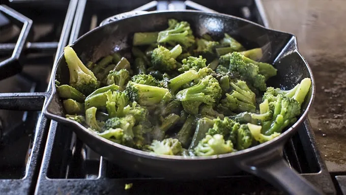 Step3In a large ovenproof non-stick skillet, add olive oil over medium-high heat. Add broccoli and asparagus, sprinkle with salt and pepper, and stir to cook for a few minutes.